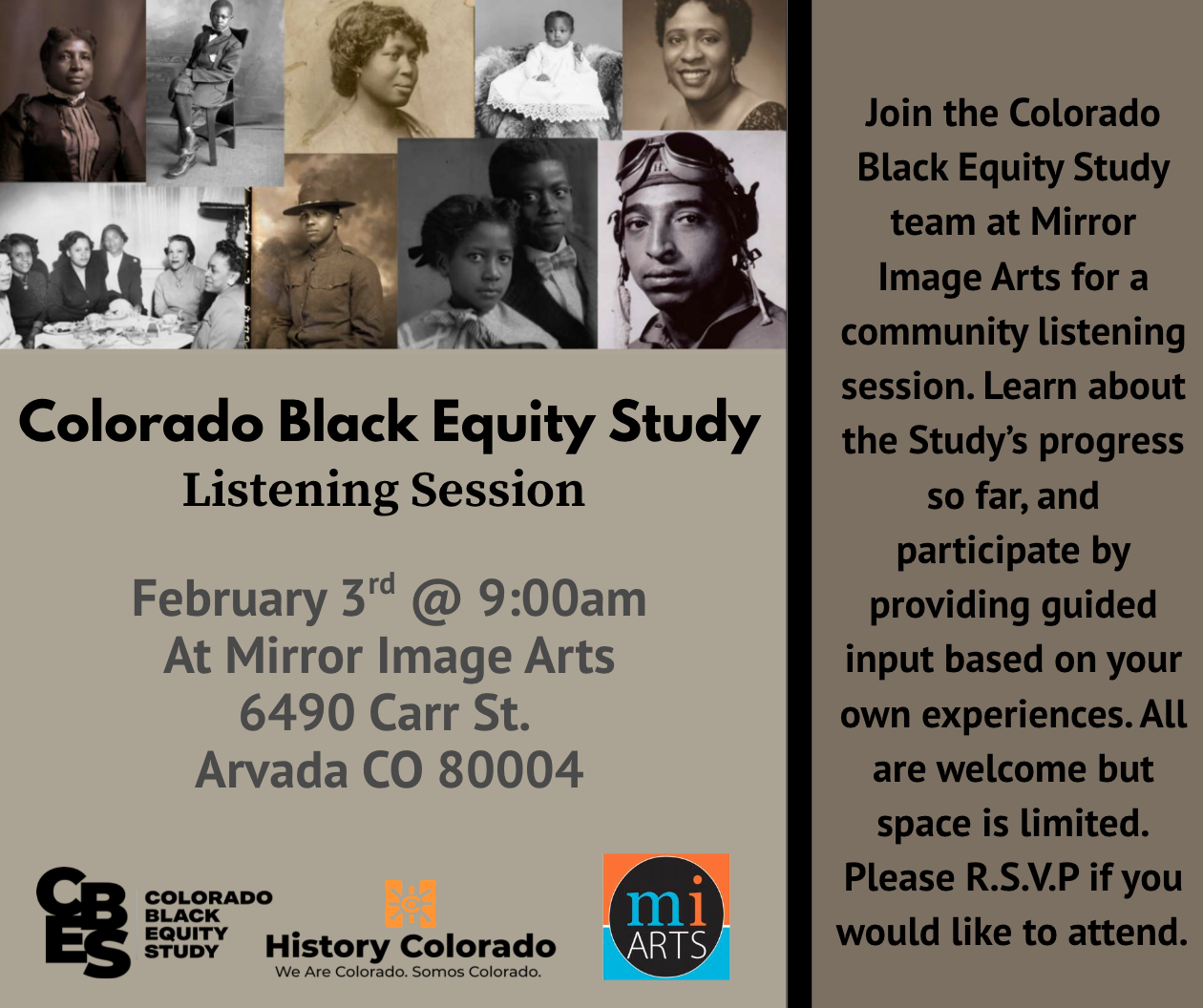 Join the Colorado Black Equity Study team at Mirror Image Arts for a community listening session. Learn about the Study’s progress so far, and participate by providing guided input based on your own experiences. All are welcome but space is limited. Please R.S.V.P using the form below if you would like to attend.