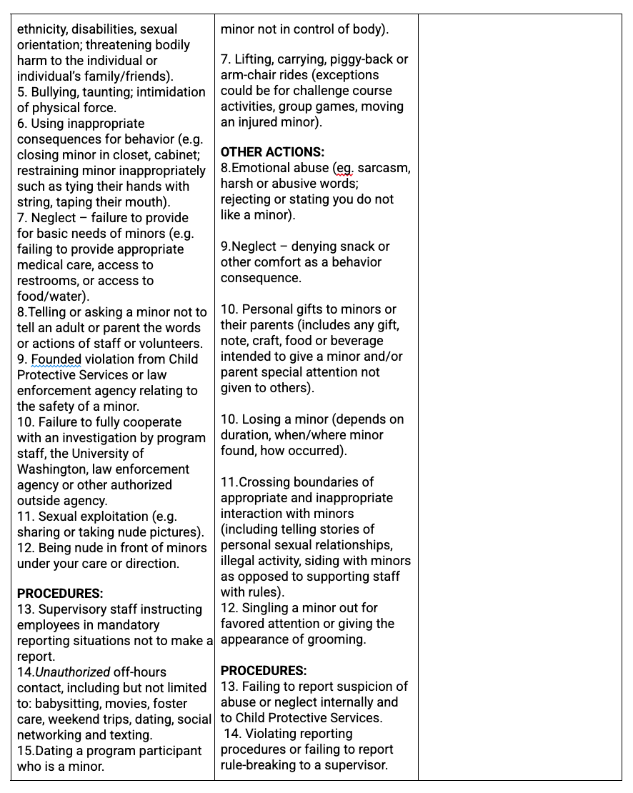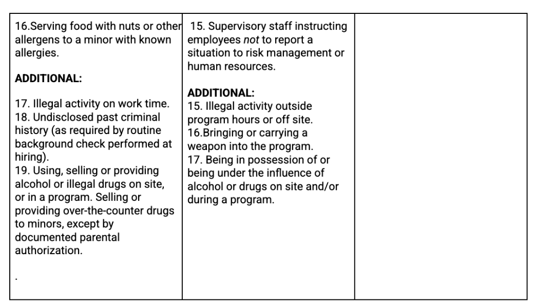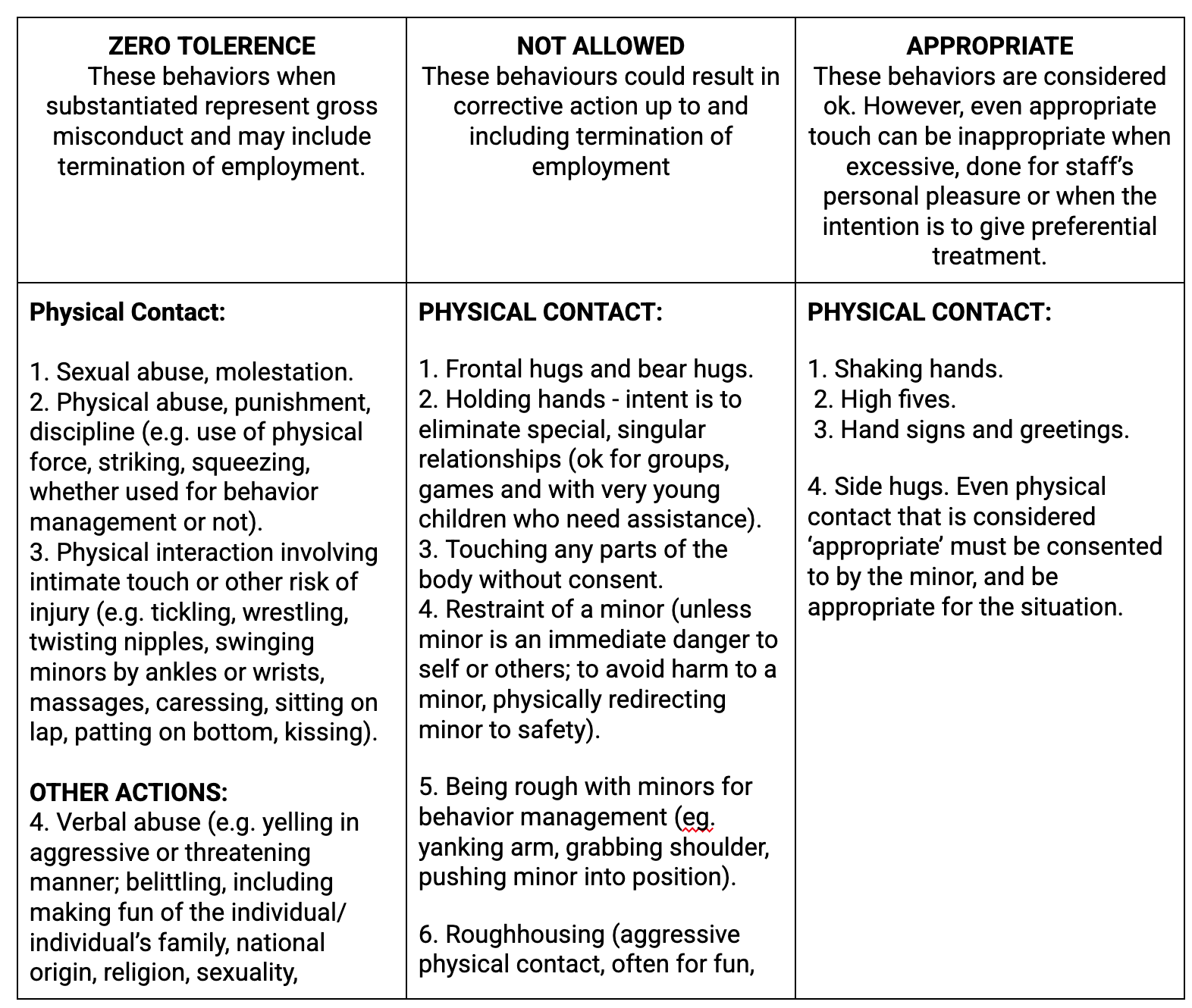 The following chart lists unacceptable and acceptable behaviors and actions with youth participants. It is intended to give clarity to unacceptable interaction between staff (employee or volunteer) and minors and the consequences for those actions. The lists are illustrative and not all-inclusive; other behaviors may be identified.